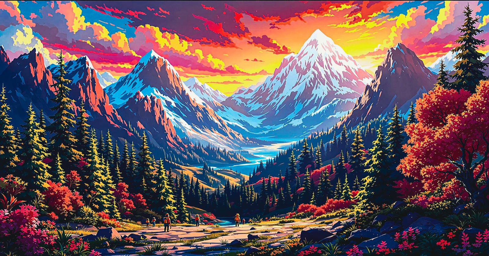 "Escape to a breathtaking mountain paradise at sunset, where vibrant hues and serene landscapes converge. This stunning digital art piece transports you to a world of tranquility, perfect for elevating your space with a touch of natural beauty and wonder."